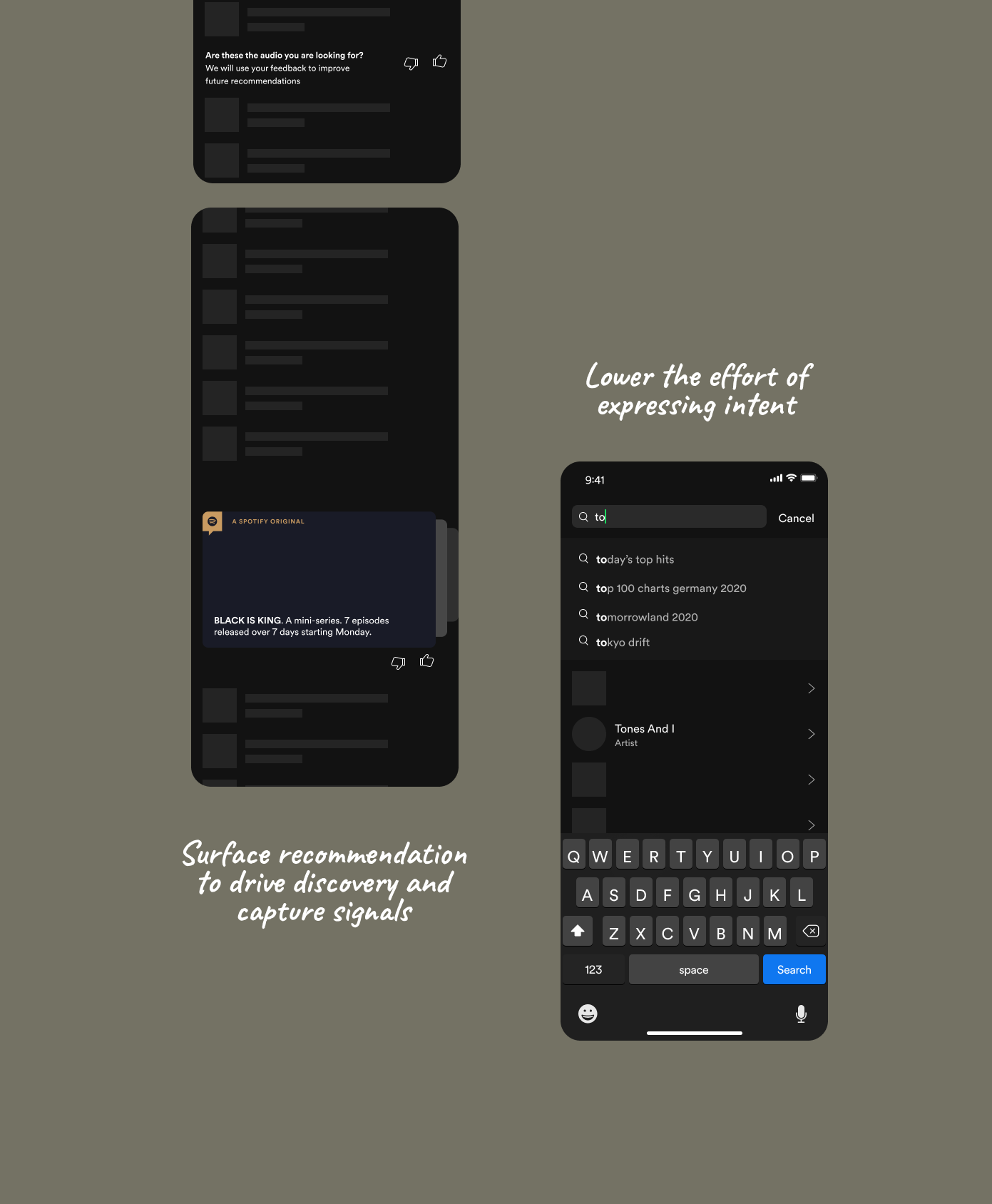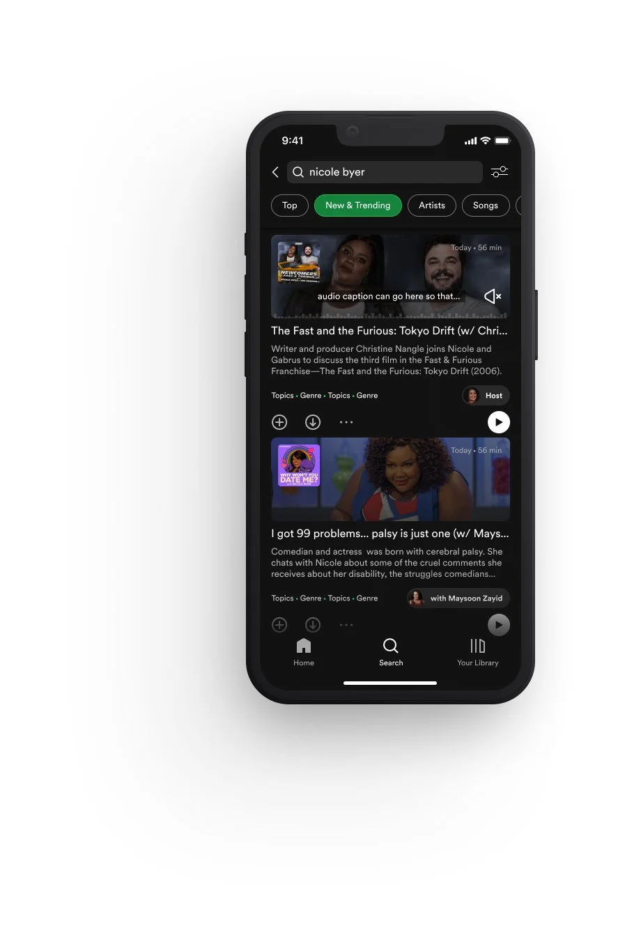 We reimagined Spotify’s search as a recommendations-first experience — shifting from simple keyword matching to intent-driven discovery. The goal: help listeners explore music, podcasts, and more through broader ideas and inspirations, not just known titles.